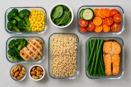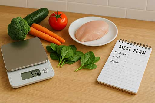 📸 Prompt (Photorealism): “Clean kitchen table with a digital food scale, vegetables, lean meat, and a handwritten weight-loss meal plan”
